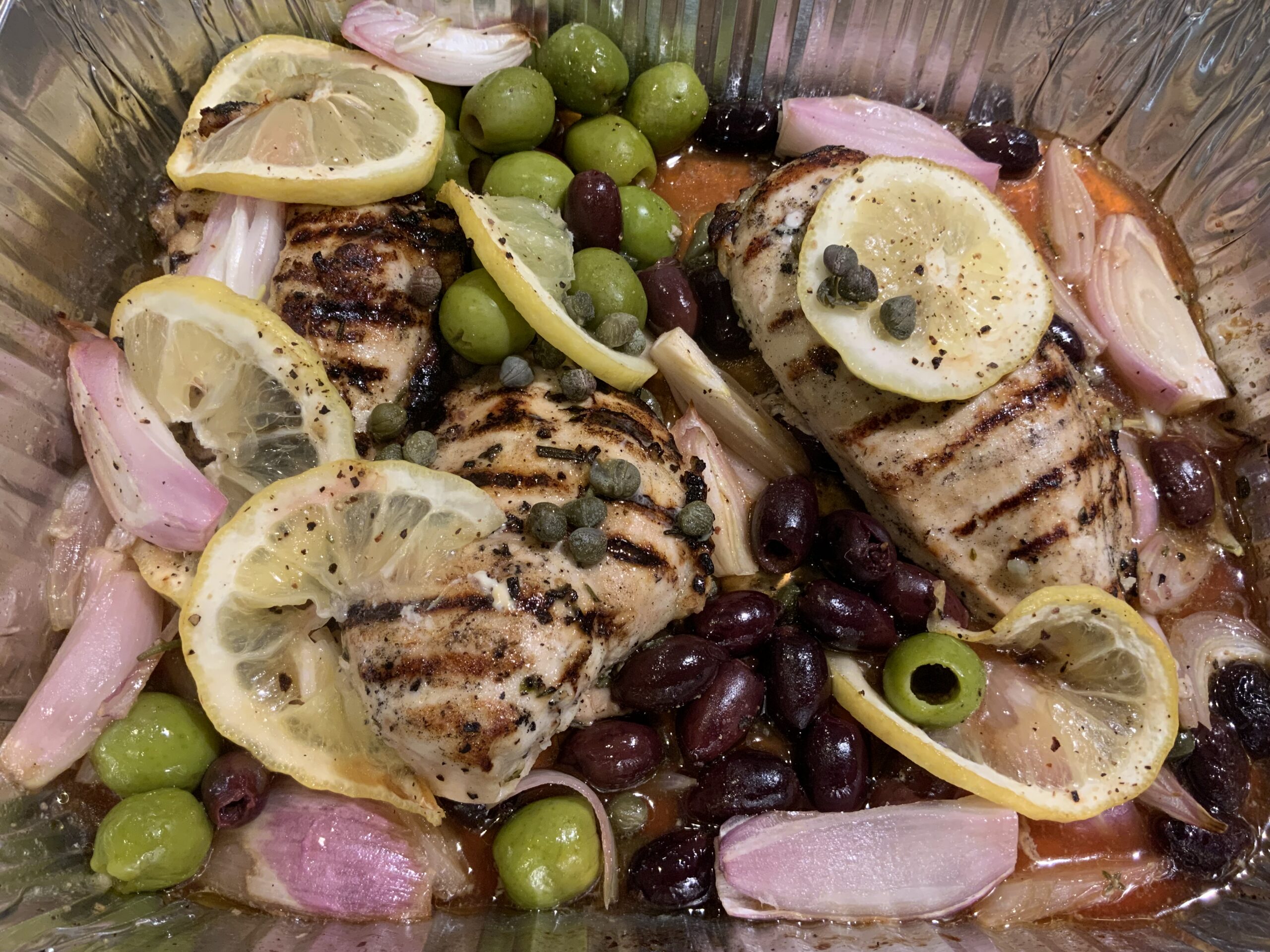 Tender chicken breasts are first seared on the grill and before adding them with the rest of the ingredients into a pan and finished off by cooking indirectly for another 15-20 minutes or until done. The seared chicken soaks up the bright, tangy pan sauce—fresh lemon juice and zest, roasted shallots, and mellow garlic—while briny green olives and bursts of capers add depth and a savory lift. The flavors balance at once bright, salty, and aromatic, finished with a sprinkle of parsley for color and a drizzle of the pan juices. Serve it over black rice and garnish with extra lemon slices and fresh herbs for a beautiful and tasty spring dish.