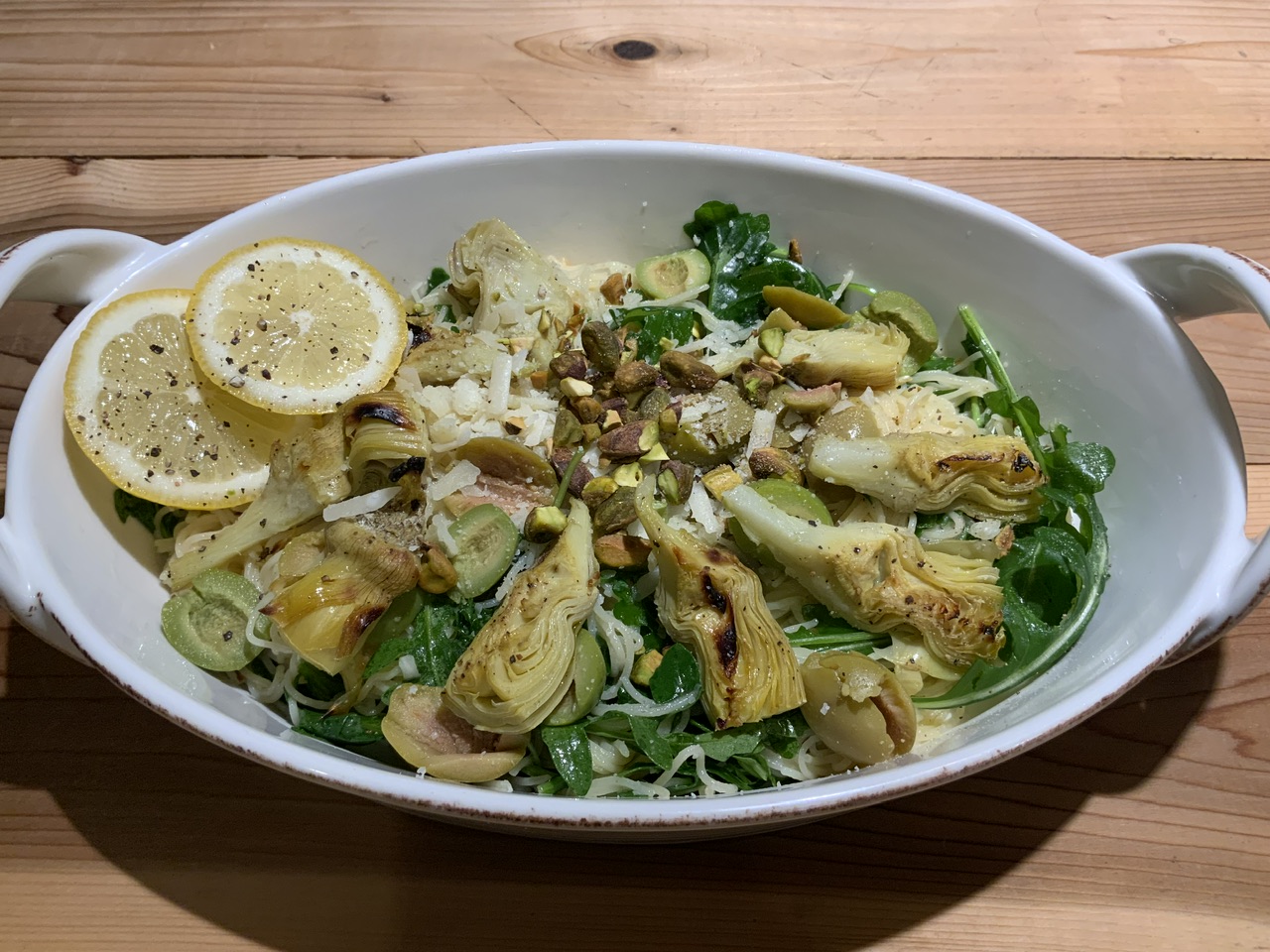 - Cook pasta to al denté. Drain and toss with warmed olive oil mixture, arugula, roasted artichoke hearts and olives. Serve in hot pasta bowls or plates, and garnish with lemon slices, pistachios and Gruyère cheese.