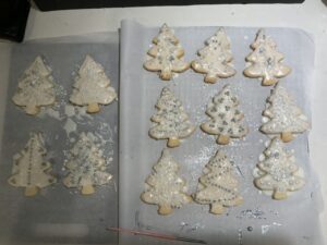 Roll dough out onto a floured cloth or board, to a thickness of approximately 1/4-inch. Cut out with Christmas tree-shaped cookie cutters and place onto the prepared baking sheet, about 1 inch apart.
